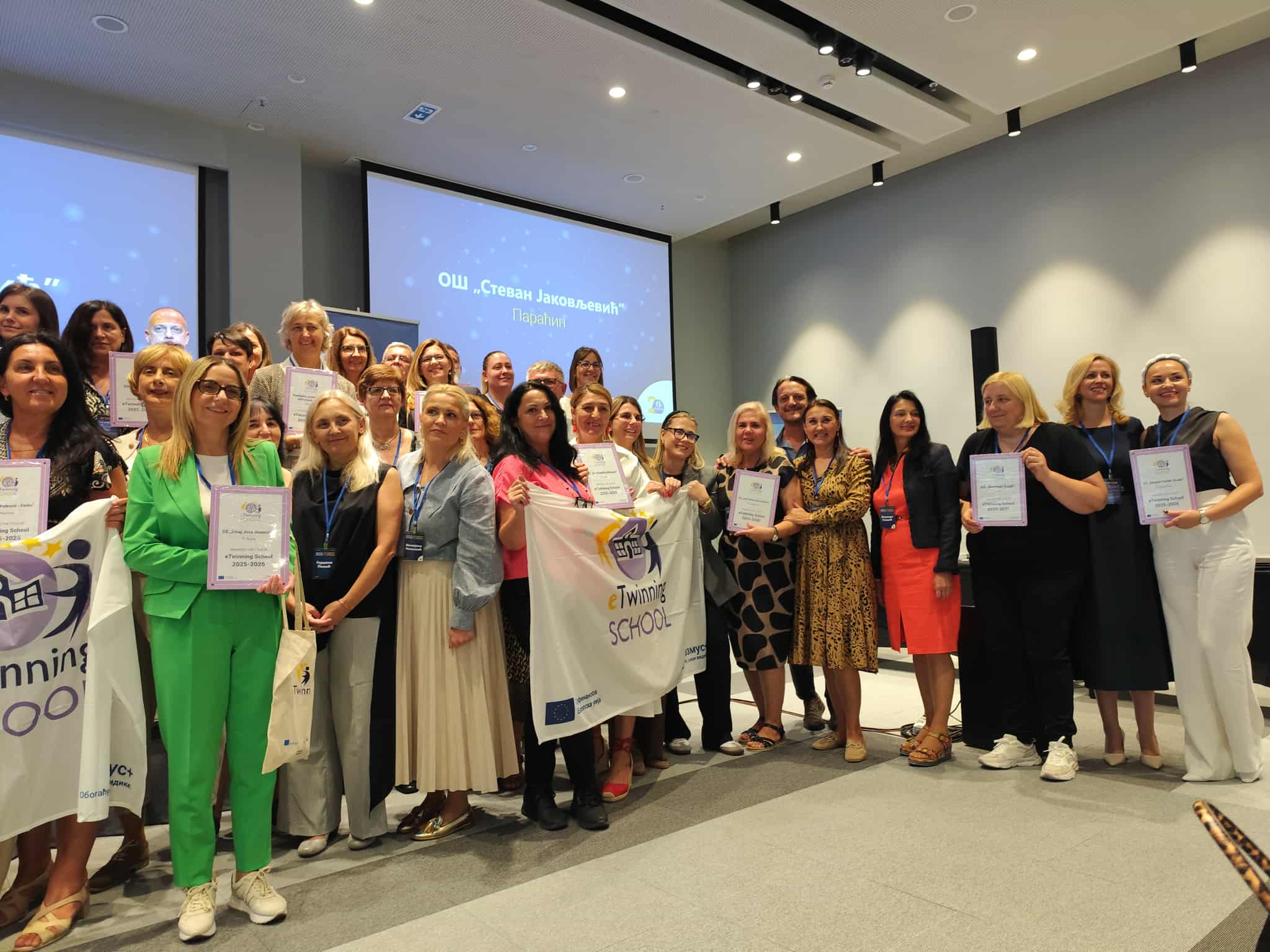Република Србија је прославила двадесети рођендан еТвининга и десету годишњицу откако смо као држава укључени у Еразмус+ програм и еТвининг као део Еразмуса. То је наставничка и ученичка друштвена мрежа која служи истовремено и као подршка и као организатор пројектне наставе у којој два партнера, из Србије и неке од партнерских земаља, започињу пројекат у који могу укључити десетине, па чак и стотине других партнера из држава Европске уније и шире. Наша школа је тог дана овенчана трећом ознаком квалитета за школе за еТвининг пројекте, а директорица Бојана Лепињица и наставница Наташа Миљановић добиле су личне ознаке квалитета за еТвининг пројекте. Један пројекат је био о учењу матерњег и страних језика уз помоћ Дуолинго апликације за мобилне телефоне, са многобројним активностима обележавања значајних дана повезаних са учењем језика, а други пројекат се бавио дигиталним грађанством.